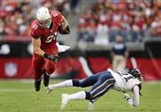 Jim Dray (No.81) of the Arizona Cardinals leaps past Janoris Jenkins of the St. Louis Rams after a reception during the two sides' National Football League game at the University of Phoenix Stadium in Glendale, Arizona on Sunday. The Cardinals defeated the Rams 30-10. It was the fifth win in the past six games for the Cardinals.