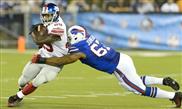 Running back Michael Cox (left) of the New York Giants is tackled by defensive end Bryan Johnson of the Buffalo Bills during the annual National Football League (NFL) Hall of Fame Game, which marks the opening exhibition action of the NFL season, in Canton, Ohio on Sunday (US time). The Giants won 17-13. Photo: AFP
