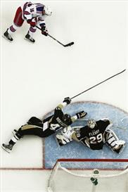 Derick Brassard (No.16) of the New York Rangers scores the game-winning goal against the Pittsburgh Penguins in the first game of the second-round NHL playoff series in Pittsburgh on Friday (US time). The Rangers won 3-2. Photo: AFP