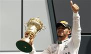 Lewis Hamilton won his home British Grand Prix for the third year in a row on Sunday with Mercedes teammate and title rival Nico Rosberg finishing second but under a stewards' investigation.