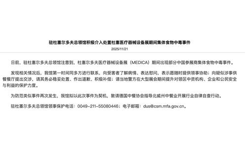 China's Consulate General in Düsseldorf said it has moved swiftly to assist Chinese exhibitors and press for accountability after a collective food poisoning incident occurred during the MEDICA 2025 – an international medical equipment exhibition in Düsseldorf, Germany, urging local authorities to strengthen protections and calling for tighter self-regulation across the Chinese restaurant industry in North Rhine–Westphalia, according to a statement on Friday from the Consulate General.