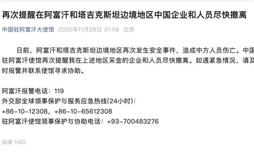 The Chinese Embassy in Afghanistan said on Friday that another security incident recently occurred in the border area between Afghanistan and Tajikistan, resulting in casualties among Chinese nationals.