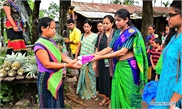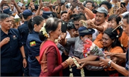 Myanmar's State Counselor and Foreign Minister Aung San Suu Kyi (center) meets with her suppoters during a peace talk conference in Chauk Kan village, Pakokku in Mgway Division on Thursday. Photo: AFP