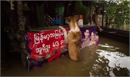 A dog attempts to climb on a table to get out of floodwaters in the Bago region, 68 kilometers away from Yangon, Myanmar, on Sunday. Heavy monsoon rains inundated Karen state, Mon state and Bago region and show no signs of abating, raising fears that the worst is yet to come. Photo: AFP