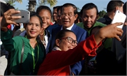 Cambodia's Prime Minister Hun Sen (center) poses for photos with passers-by as he attends the official launch of a public shuttle boat in Phnom Penh on Wednesday. Hun Sen won the country's general election on Sunday. Photo: AFP