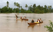 Villagers near Hpa-an, the capital of Myanmar's Karen state, travel across floodwaters on small boats on Wednesday, to pick up food and other emergency supplies. About 120,000 people have been displaced after floods submerged vast swathes of southeastern Myanmar, killing 11 people, as heavy monsoon rains batter the Mekong region. Photo: VCG