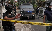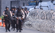 Armed members of the Indonesian Mobile Brigade Corps walk past barbed wire placed in front of a gate of the brigade's police headquarters in Depok on Wednesday. Indonesian police announced that several police officers were injured during a riot involving terrorists that broke out on Tuesday at the Mobile Brigade detention center. Photo: IC