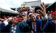 Japanese festival-goers carry a portable shrine as they parade in the streets of Asakusa district in Tokyo during one of the city's largest festivals called “Sanja Matsuri” on Sunday. Photo: VCG