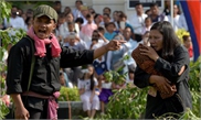 Students take part in a performance to mark the annual “Day of Anger” at the Choeung Ek memorial in Phnom Penh, Cambodia on Sunday. Cambodians observe the annual “Day of Anger” against genocidal Khmer Rouge regime that ruled the country from 1975-79. Photo: AFP