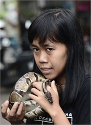 An Indonesian girl shows off her snake outside a pet store in Jakarta on Sunday, at the conclusion of the week-long Eid al-Fitr festival. Photo: AFP