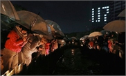 Japanese mourners protect candles from the rain as they commemorate the 23rd anniversary of the Great Hanshin earthquake at a park in Kobe, Hyogo prefecture on Wednesday. More than 6,400 people were killed in the massive earthquake which hit near Kobe, Japan in 1995. Photo: AFP