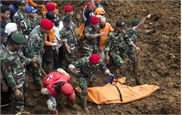 Soldiers wrap one of the five victims of a landslide in Maseng-Cijeruk-Bogor-West Java on Tuesday. The landslide was caused by heavy rain and the poor construction of the railway near houses built below. Photo: VCG