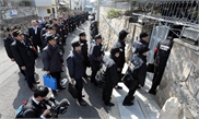 Police officers prepare to raid the Yamaguchi-gumi's headquarters in Kobe on Monday to look for evidence of fraudulent cash withdrawals from ATMs in 2016. Yamaguchi-gumi is Japan's largest yakuza crime syndicate. Authorities said money was withdrawn simultaneously with forged cash cards from convenience store ATMs in 17 prefectures including Tokyo, Aichi and Osaka. Photo: IC