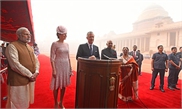 Belgium's royal couple King Philippe (center) and Queen Mathilde (2L), Indian President Ram Nath Kovind (4L), his wife Savita, and Prime Minister Narendra Modi (L) pose amid heavy smog on Tuesday during the ceremonial reception at Rashtrapati Bhawan, in New Delhi, India. Photo: IC