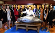 Miss International Beauty Pageant contestants pose with Kiyoshi Kimura (C), president of sushi restaurant chain Sushi-Zanmai, and a 250-kilogram bluefin tuna at his main restaurant near the Tsukiji fish market in Tokyo on Sunday. The 69 contestants will compete for the Miss International crown on Tuesday in Tokyo. Photo: AFP