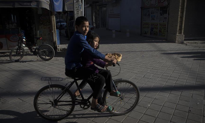 Afghan refugee children ride a bicycle on the outskirts of Mashhad, Iran, Nov. 2, 2020. (Xinhua/Ahmad Halabisaz)