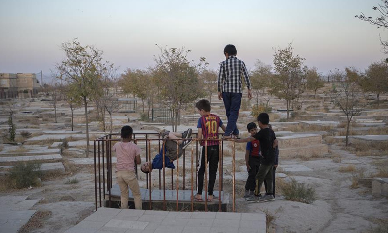 Afghan refugee boys play at a cemetery on the outskirts of Mashhad, Iran, Nov. 2, 2020. (Xinhua/Ahmad Halabisaz)