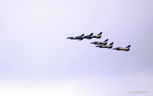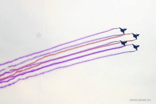 Planes of the Bayi Aerobatic Team of the Chinese People's Liberation Army (PLA) Air Force makes their debut during Moscow's MAKS 2013 International Aviation and Space show in the city of Zhukovsky near Moscow, Russia, Aug. 30, 2013. Since it was established 51 years ago, the team has performed for 668 delegations from 166 countries and regions, but the Moscow tour marks the team's first show abroad. (Xinhua/Dai Tianfang)