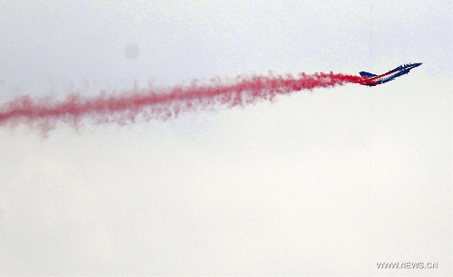 A plane of the Bayi Aerobatic Team of the Chinese People's Liberation Army (PLA) Air Force makes its debut during Moscow's MAKS 2013 International Aviation and Space show in the city of Zhukovsky near Moscow, Russia, Aug. 30, 2013. Since it was established 51 years ago, the team has performed for 668 delegations from 166 countries and regions, but the Moscow tour marks the team's first show abroad. (Xinhua/Dai Tianfang)