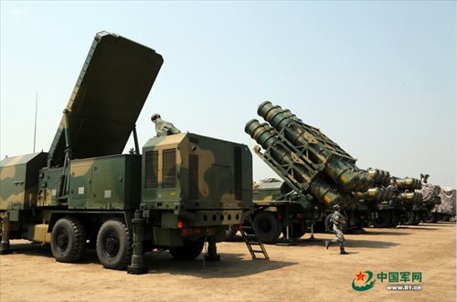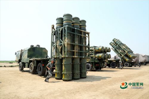 HQ-16 anti-aircraft missiles are seen in a training exercise organized by an air defense brigade under the Chinese PLA’s 65th Group Army at a training base in the Bohai Bay, China. Photo: english.chinamil.com.cn