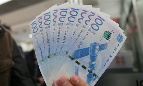 A citizen shows a handful of commemorative bills in Beijing on Thursday. The People's Bank of China, the country's central bank, issued a commemorative aerospace bill on Thursday. With the face value of 100 yuan ($15.65), the blue commemorative bills feature a picture of the Shenzhou-9 spacecraft docking with the Tiangong-1 space lab in orbit. Photo: CFP