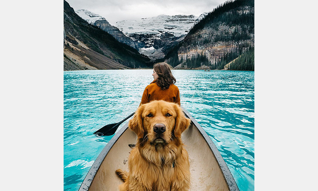 Aspen, a golden retriever, travels with her owner on a boat in a crystal clear lake in North America. Photo: Hunter Lawrence/pix Media/VCG