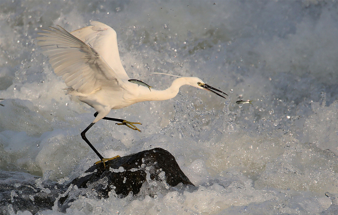 An egret snatches a fish out of the air while standing on a rock in the Xin’an River in Huangshan, East China’s Anhui Province, on July 8, 2018. Photo: VCG