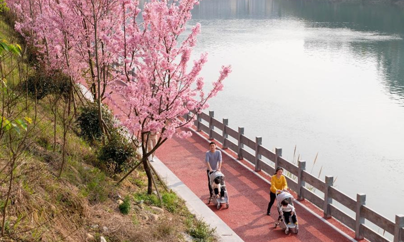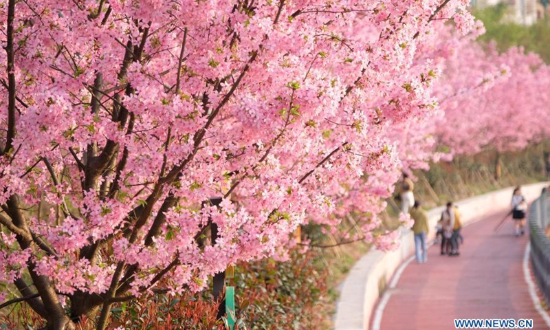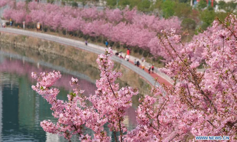 Photo taken on Feb. 22, 2021 shows people enjoying the scenery of cherry blossoms at Sanjiang Town of Jinping County in Qiandongnan Miao and Dong Autonomous Prefecture, southwest China's Guizhou Province.(Photo: Xinhua)