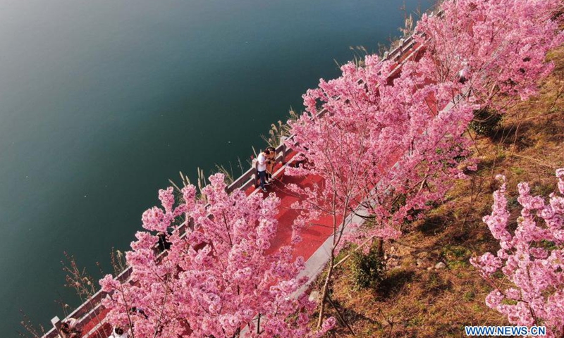 Aerial photo taken on Feb. 22, 2021 shows people enjoying the scenery of cherry blossoms at Sanjiang Town of Jinping County in Qiandongnan Miao and Dong Autonomous Prefecture, southwest China's Guizhou Province.(Photo: Xinhua)