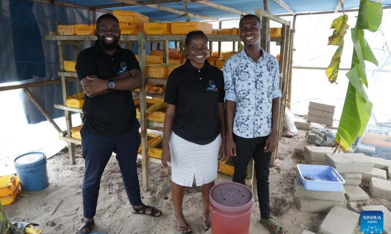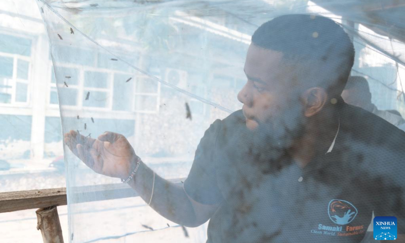 Arnold Shoko, a co-founder of Samaki Farms, shows black soldier flies in Dar es Salaam, Tanzania, on April 21, 2022. Six young aquatic and fisheries science graduates from Tanzania's leading state-run university have joined hands to save fish farmers from the headache of finding suitable fish feeds. (Photo: Xinhua)
