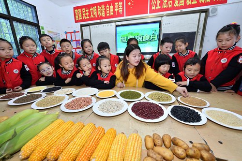 A teacher helps primary school students in Baokang county, Central China's Hubei Province, identify different grains. This is part of activities across the country to raise students' awareness of protecting food ahead of World Food Day, which falls on Wednesday. Photo: VCG