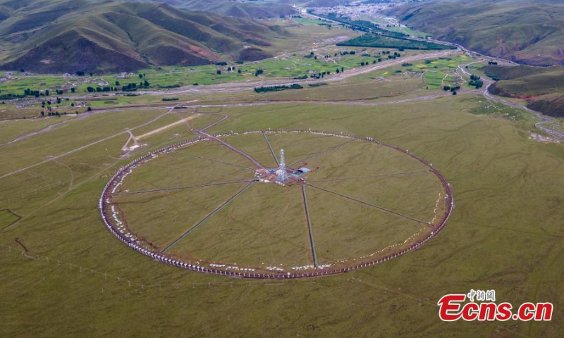 Aerial view shows the parabolic antennas in a circle in Daocheng county, Ganzi Ganzi Tibetan Autonomous Prefecture, southwest China's Sichuan Province, June 29, 2022. (Photo: China News Service/Liu Zhongyan)