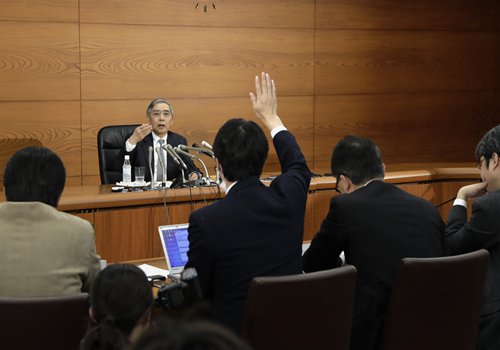 Haruhiko Kuroda, governor of the Bank of Japan (BOJ), takes a question during a news conference at the central bank’s headquarters in Tokyo on Tuesday. The BOJ kept monetary policy steady and took a more upbeat view of the economy, reinforcing market expectations that it could begin tightening monetary policy, including raising interest rates, Reuters reported. Photo: CFP