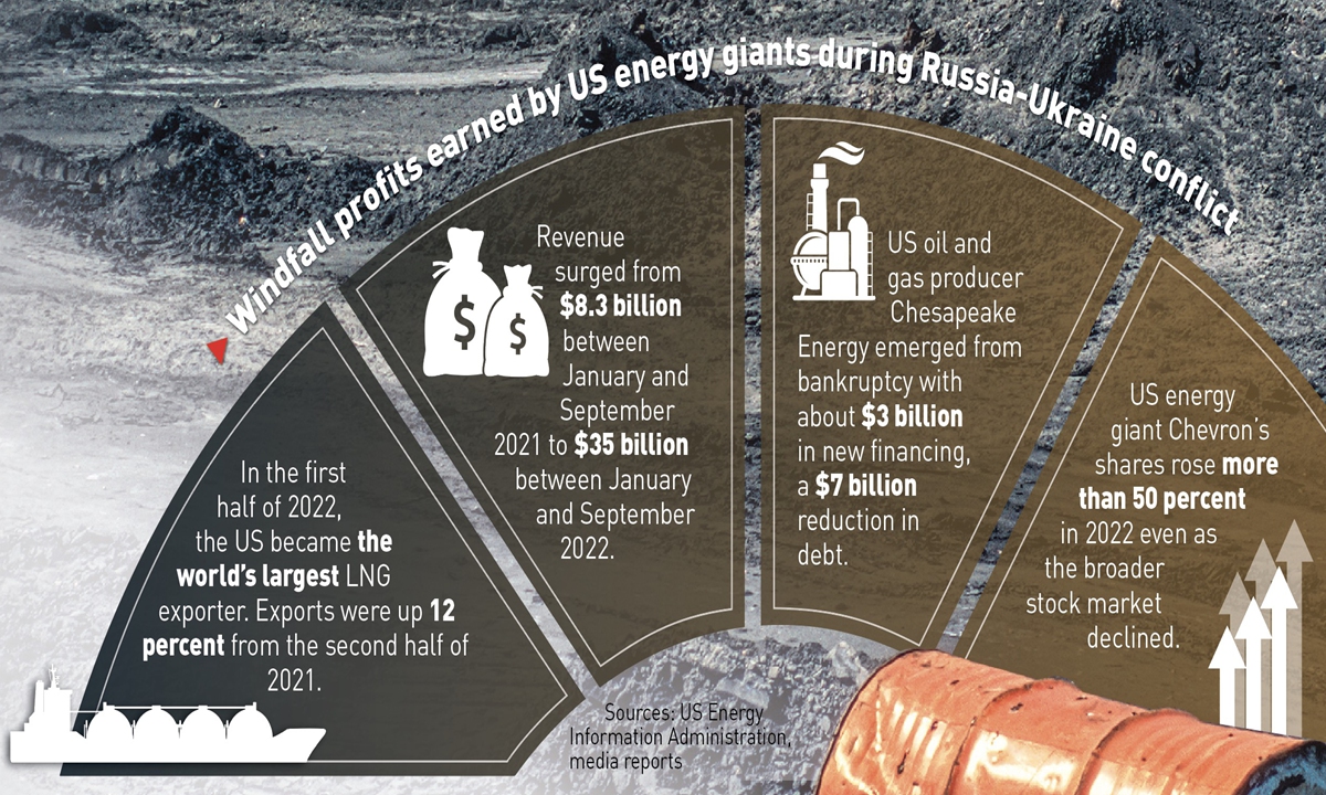 Take a look at how much the US is making by expanding its energy footprint in the Russia-Ukraine conflicts: In the first half of 2022, the US became the world's largest LNG exporter. Exports were up 12 percent from the second half of 2021; According to data from the US Energy Information Administration, revenue surged from $8.3 billion between January and September 2021 to $35 billion between January and September 2022; US oil and gas producer Chesapeake Energy emerged from bankruptcy with about $3 billion in new financing, a $7 billion reduction in debt, and $1.7 billion cut from gas processing and pipeline costs, Reuters reported; Shares of the above-mentioned US energy giant Chevron rose more than 50 percent in 2022 even as the broader stock market declined, CNBC reported.