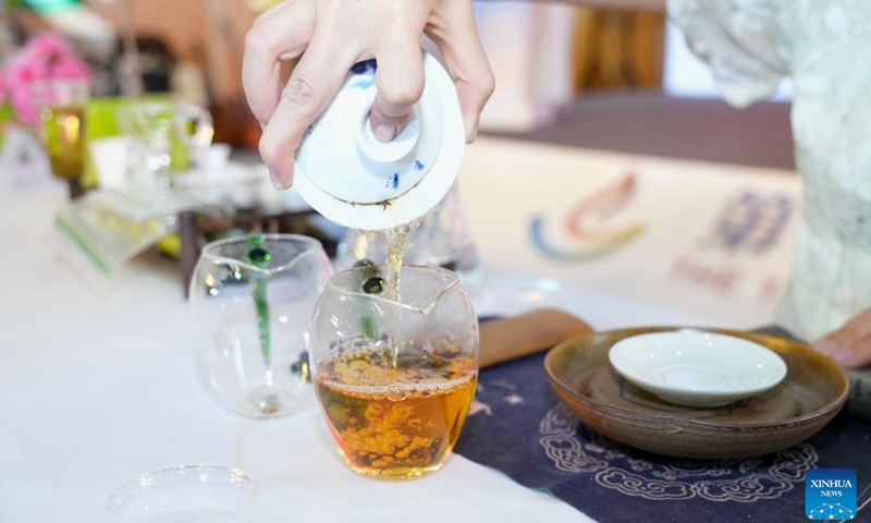 A tea artisan performs at Beijing International Tea and Tea Ceremony Exhibition in Beijing, capital of China, on April 21, 2023. The four-day event will last till April 24.(Photo: Xinhua)