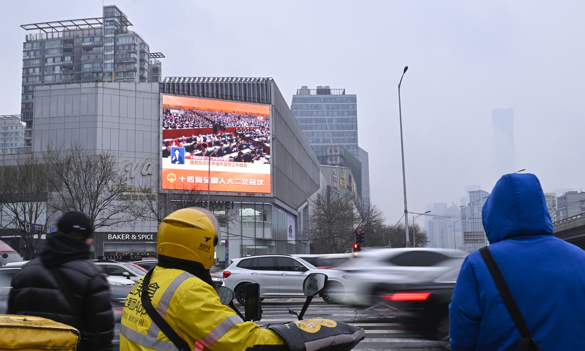People watch the opening meeting of the second session of the 14th National People's Congress on an outdoor large screen in Beijing on March 5, 2024. Photo: cnsphoto