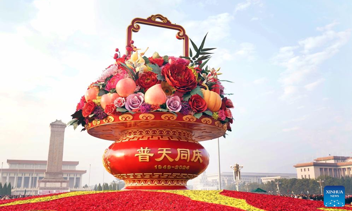 This photo taken on Sept. 25, 2024 shows a "flower basket" at Tian'anmen Square in Beijing, capital of China. The 18-meter-tall display in the shape of a flower basket is placed at Tian'anmen Square as a decoration for the upcoming National Day holiday. Photo: Xinhua