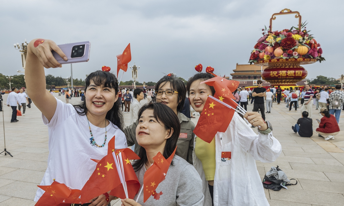 Tourists pose for a photo in front of a giant floral basket at Tian'anmen Square in Beijing to celebrate National Day. Photo: Li Hao/GT