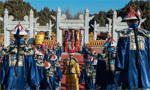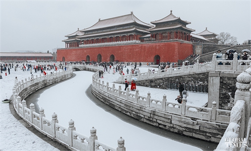 On December 12, Beijing saw its first snowfall of winter 2025. At the Palace Museum, visitors dressed in traditional costume strolled and took photos in front of the snow-covered ancient buildings. Photos: Li Hao/GT