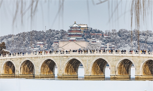 The Summer Palace was transformed into a snow-covered wonderland this weekend following Beijing's first snowfall of 2026. The historic site, now resembling a fairy-tale landscape, drew numerous residents and tourists to enjoy the view and take photographs. Photos: Li Hao/GT