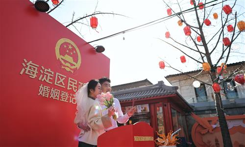 The Marriage Registration Office of Beijing's Haidian District Civil Affairs Bureau organized a themed marriage registration event on Valentine's Day. Titled "Same Cheers, Floral Charms," it offered couples integrated services including registration, photo opportunities, and interactive activities, creating a festive ...