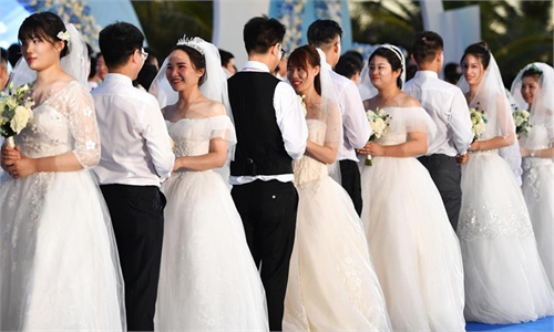 Newly-married couples attend a group wedding ceremony in Boao, south China's Hainan Province, June 6, 2020. A group wedding ceremony was held here on Saturday for 30 newly-married couples from Beijing, Wuhan, Guangzhou among others. Some of the newly married people's wedding ceremonies had been postponed by their work in the fight against coronavirus outbreak in Hubei Province. (Xinhua/Zhang Yuwei)