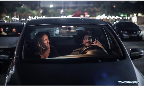 People watch a movie inside their cars at a drive-in cinema amid the COVID-19 outbreak in Sao Paulo, Brazil, on June 17, 2020. (Xinhua/Rahel Patrasso)