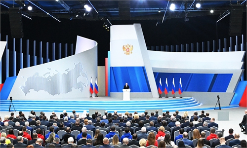 Russian President Vladimir Putin delivered his annual State of the Nation Address on Thursday. It was a key occasion for him to project confidence about Russia's development under the pressure from the West and Russia's "special military operation" in Ukraine before the presidential election in March. Commenting on the speech, analysts said Putin is telling the world that Russia is not concerned at all and is even satisfied with the current situation. Moscow is waiting for the US for talks, the analysts said.