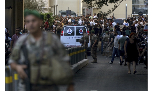 Lebanese army soldiers secure the area for an ambulance to enter the premises of the American University hospital in Beirut on September 17, 2024, after coordinated explosions of pagers across Lebanon the same day. At least 12 were killed as of press time. Photo: VCG