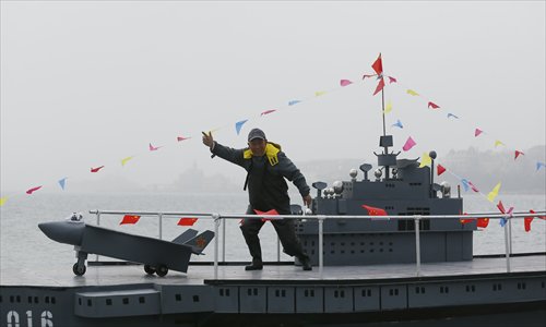 Octogenarian Wen Yuzhu poses on the deck of his homemade replica of the aircraft carrier Liaoning on Saturday during its first voyage off the coast of Qingdao, Shandong Province. Photo: CFP