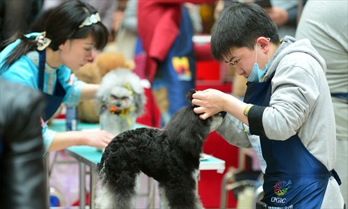 A total 27 pet groomers doll up dogs during a charity event aiming to raise money for rescued animals in Qingdao, Shandong Province on Saturday. The activity raised several thousands of yuan in cash and other donations worth 10,000 yuan. Photo: IC