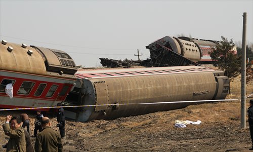 Police officers guard derailed carriages of the K7034 train in the city of Suihua in Northeast China’s Heilongjiang Province on Sunday morning. Fifteen people were injured when the express derailed in Hailun county en route from Heihe to the provincial capital of Harbin. No deaths were reported. Photo: CFP