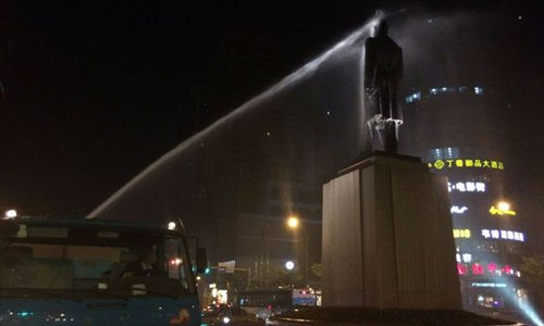A sprinkler cleans a statue of Dr Sun Yat-sen, a renowned statesman who led the revolution ending imperial rule in China, in downtown Nanjing on Wednesday night in the countdown to the 2014 Youth Olympic Games. The Youth Olympic Games will be held in Nanjing from August 16 to 28. Photo: CFP