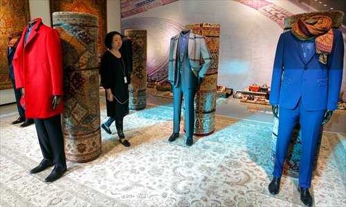 A visitor peruses suits designed by Paul Smith at 92 Tongren Road Thursday. The exhibition features products created by the English fashion designer. Photo: Yang Hui/GT